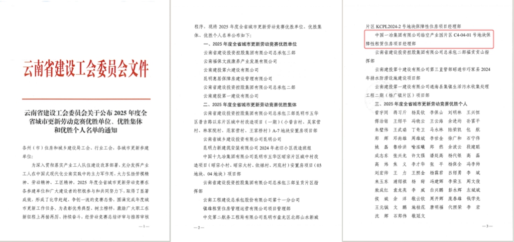 1月12日,由中國一冶交通分公司承建的云南臨空產(chǎn)業(yè)園片區(qū)C4-04-01號(hào)地塊保障性租賃住房項(xiàng)目獲得云南省建設(shè)工會(huì)委員會(huì)“2025年度全省城市更新勞動(dòng)競賽”優(yōu)勝集體榮譽(yù)。